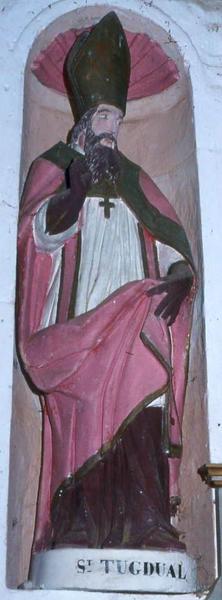 Saint Tugdual est représenté en évêque, coiffé de la mitre, vêtu de la chape et faisant le geste de la bénédiction de la main droite.