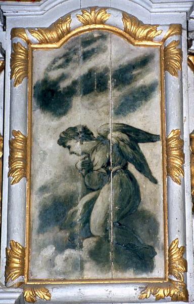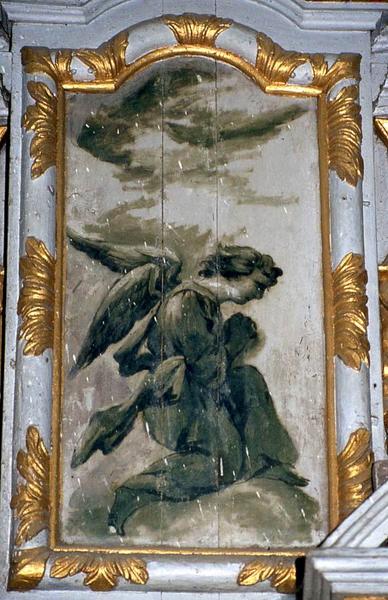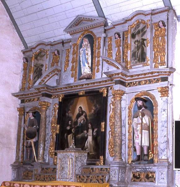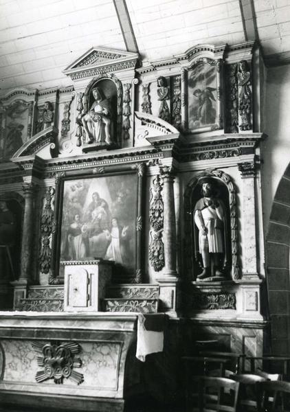 Retable composé de trois travées et de trois registres. Au centre, une huile sur toile est encadrée de deux colonnes sur piédestaux. Les travées latérales sont symétriques : elles sont ornées d'une statue dans une niche. Au registre supérieur, le fronton demi-circulaire central est interrompu par une niche à fronton triangulaire abritant une statue. De part et d'autre, deux panneaux peints représentent des anges de profil en grisaille.