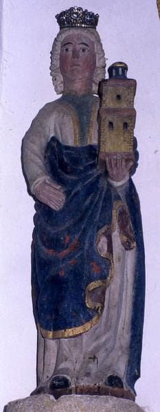 Sainte Barbe porte sur la paume de sa main gauche une tour miniature.