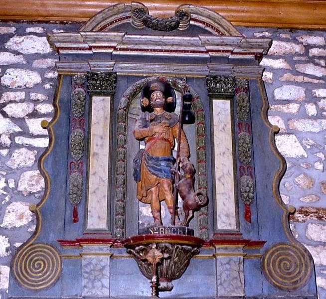 Saint Roch est représenté en pèlerin, coiffé de son chapeau à larges bords et de sa pèlerine ornées de coquilles. Il s'appuie sur un bâton auquel est accrochée une gourde. A ses pieds un chien lui tend un pain.