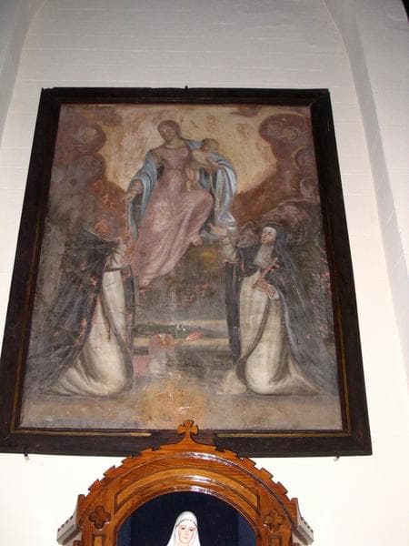 La Vierge à l'Enfant apparaît à saint Dominique de Guzman et à sainte Catherine de Sienne, tous deux agenouillés au sol. Ils reçoivent le rosaire.