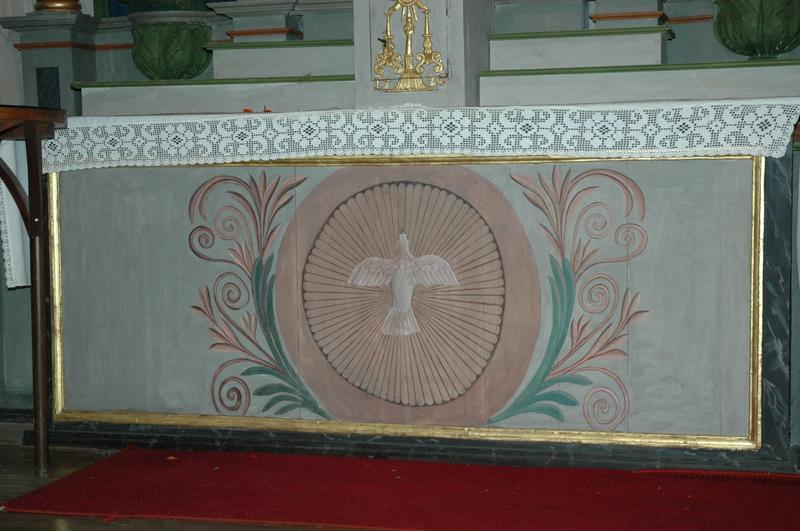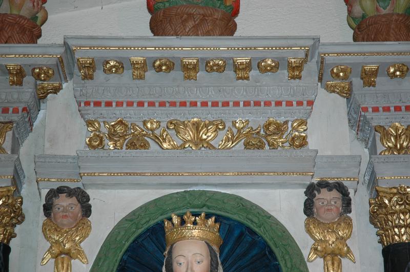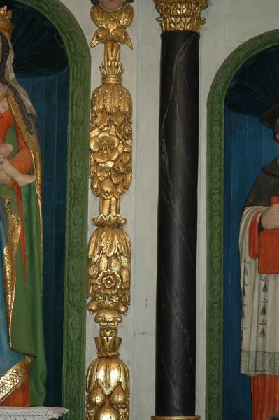 Retable composé de trois niches séparées par des colonnes : au centre, la Vierge à l'Enfant (classée Monument Historique le 21 octobre 1947), à gauche, sainte Marguerite, et à droite saint Patern.