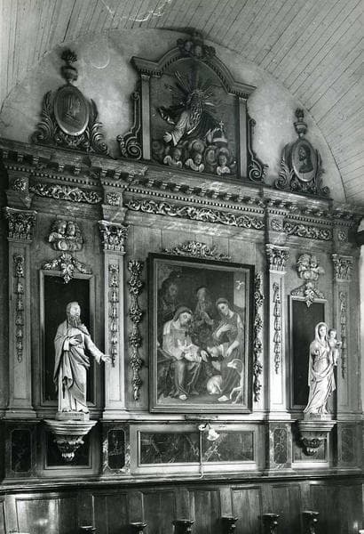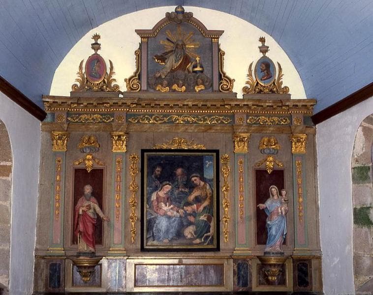 Retable tripartite lambrissant le mur : au centre, une peinture à l'huile sur toile représentant l'Adoration des bergers, encadrée de deux statues, à droite la Vierge à l'Enfant et à gauche, Saint Pierre, chacune flanquée de pilastres. Au registre supérieur, une figuration de Dieu le Père surmonte le tableau central, encadrée de deux médaillons présentant les profils du Christ et de la Vierge.