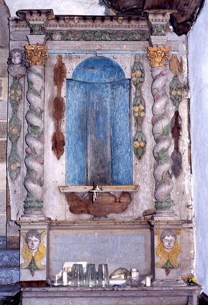 Statue dans une niche encadrée de colonnes torses autour desquelles s'enroulent des grappes de raisins.