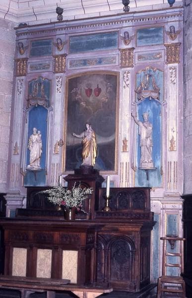 Retable formé de boiseries lambrissant le mur du croisillon sud. Au centre, un tableau peint à l'huile représentant le Sacré-Coeur de Jésus et de Marie, derrière une statue de la Vierge à l'Enfant. De part et d'autre du tableau, une statue en terre cuite, encadrée de pilastres.