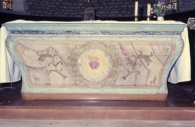 Autel orné au centre des deux Coeurs Sacré de Jésus et de Marie, en flammes. Tabernacle orné d'un ciboire.