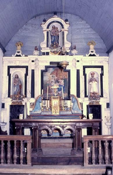 Retable tripartite à deux registres : dans la partie inférieure, le tableau central (PM56005239) est encadré de deux colonnes et de deux statues dans des niches, Saint Jean-Baptiste (PM56005236) à gauche et Saint Charles (PM56005237) à droite. La partie supérieure est ornée de la statue de la Vierge à l'Enfant (PM56005238) dans une niche flanquée de pots à feu et de corbeille de fruits.
