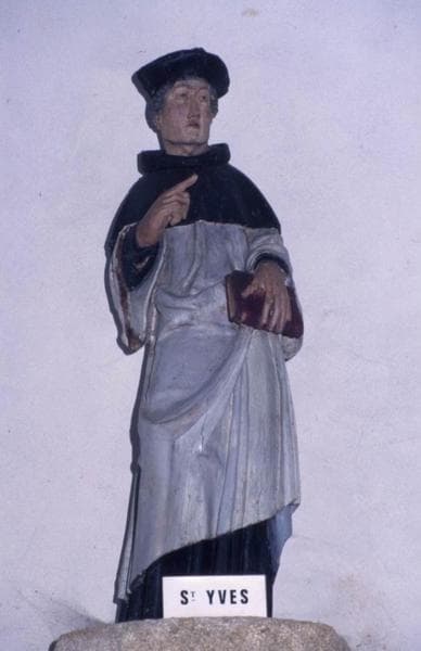 Saint Yves est coiffé d'une barrette et vêtu d'une robe d'avocat. Il tient un livre dans la main gauche.