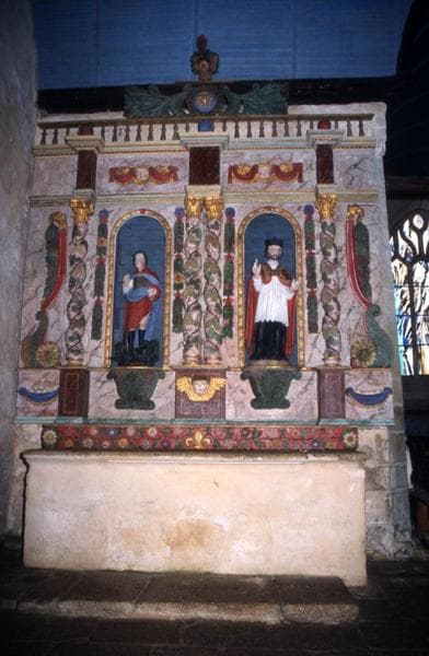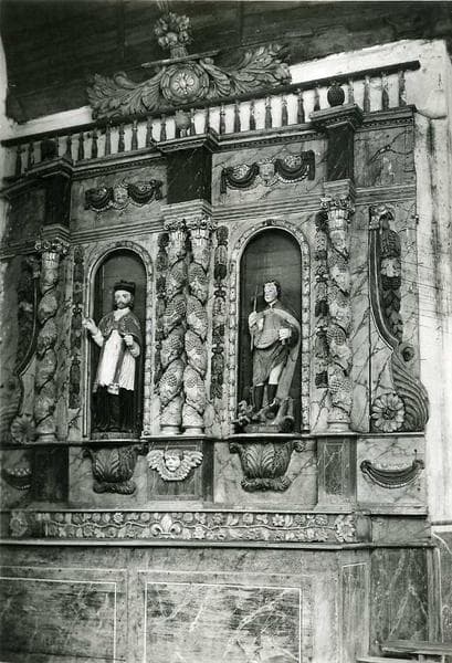 Retable orné de deux statues séparées par des doubles colonnes torses soutenant un entablement et une balustrade.