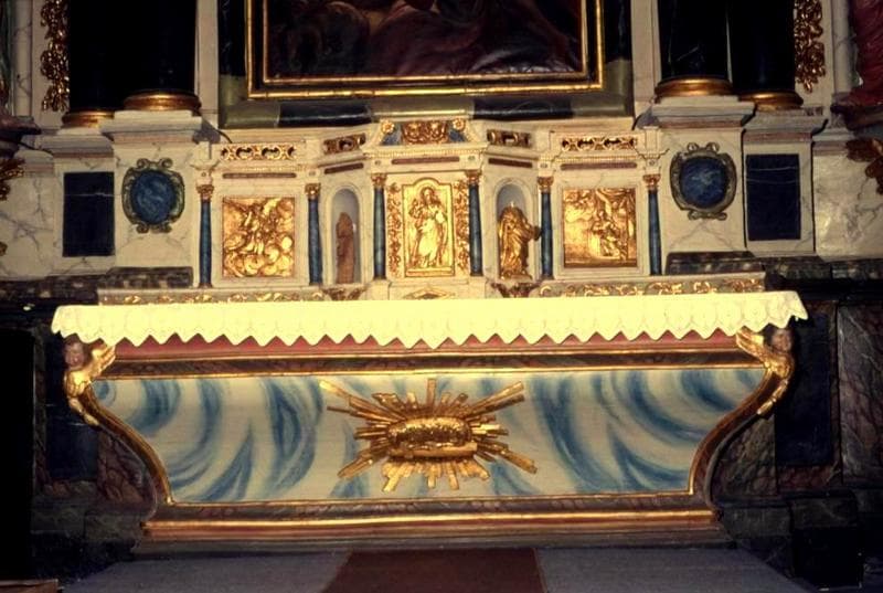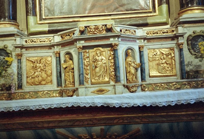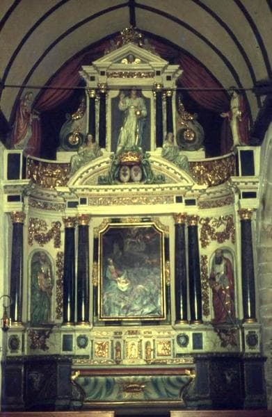 retable du maître-autel et cinq statues : Saint Pierre, Saint Paul, Christ au globe, Vierge et Christ