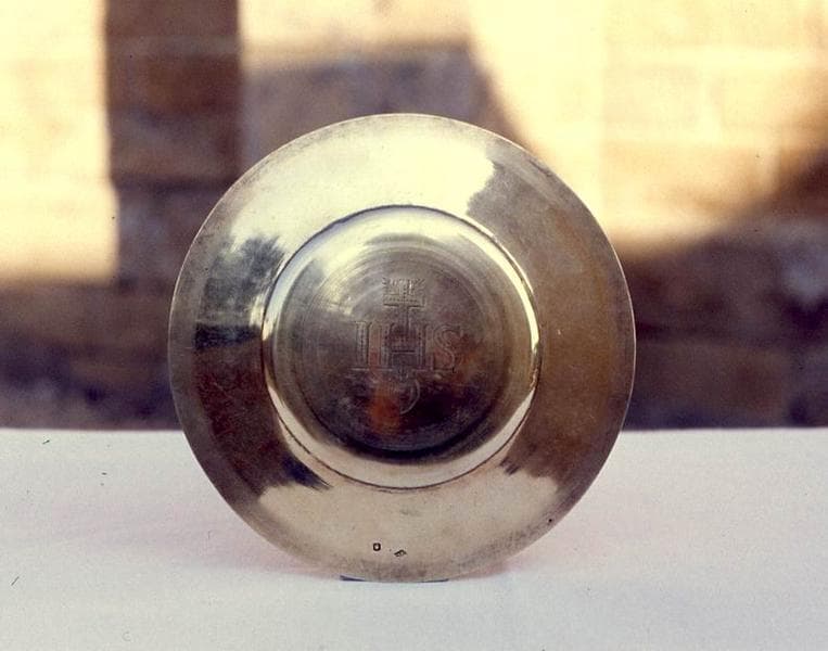 Patène ornée du monogramme du Christ encadré d'une croix latine et d'un coeur.
