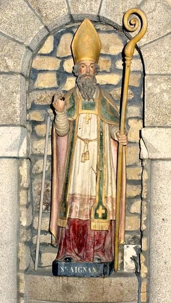 Saint Aignan est représenté en évêque, coiffé de la mitre, vêtu d'une chape et d'une étole et tenant de la main gauche la crosse.