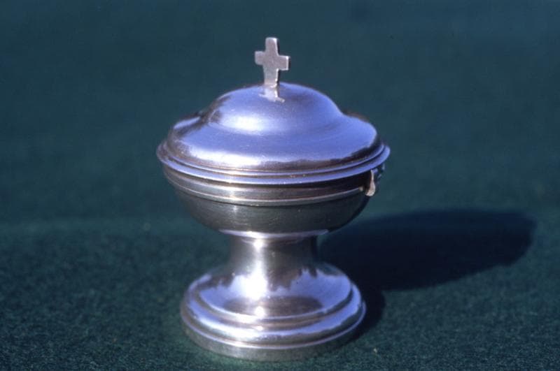 Petit ciboire des malades sur pied court, fermé par un couvercle sommé d'une croix plate. L'intérieur est en argent doré (vermeil).