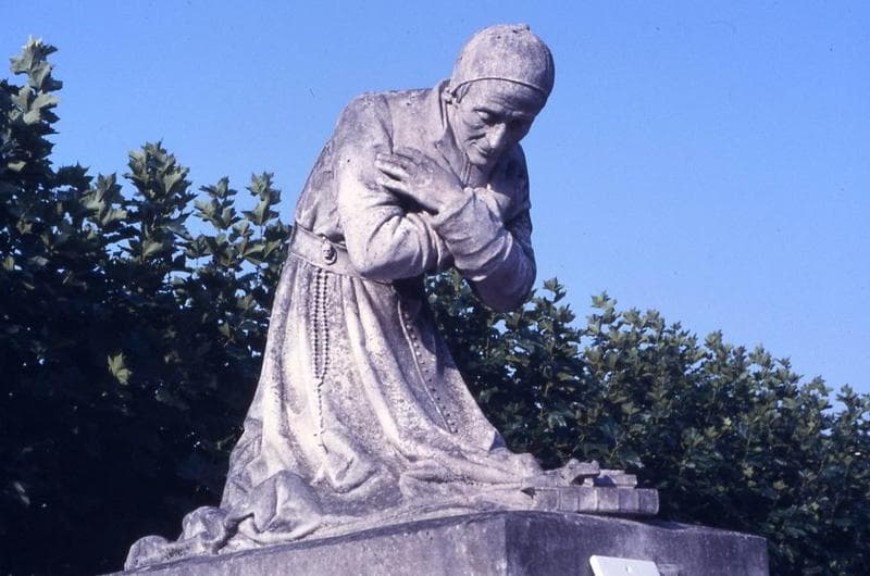 Le père Leleu est représenté à genoux, les mains croisées sur la poitrine, dans la position qu'il avait au moment de sa mort.