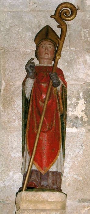 saint Cadoc : chasuble, mitre, crosse, bénédiction