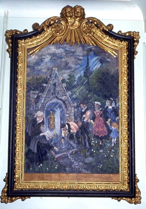 La partie supérieure est formée de deux volutes encadrant deux têtes d'angelots émergeant d'une gloire.