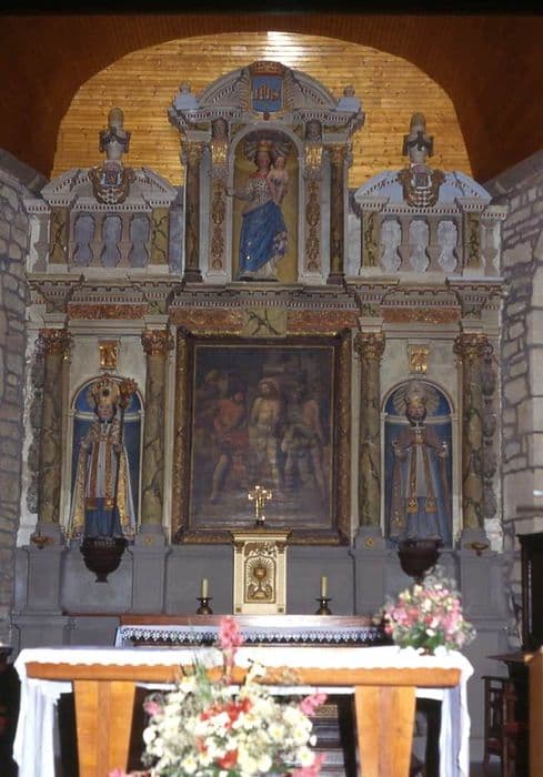 Retable tripartite composé au centre d'une huile sur bois représentant la Flagellation encadrée de deux statues dans des niches, flanquées de colonnes. L'entablement supporte un édicule abritant la Vierge à l'Enfant et deux balustrades.
