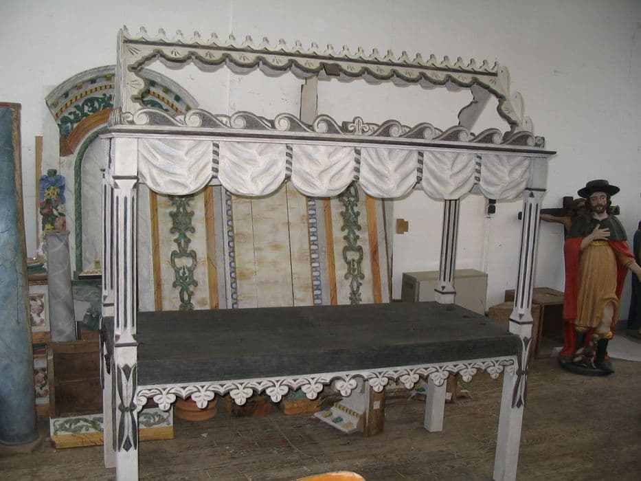 Ce catafalque est constitué d'un dais en forme de toit en bâtière sculpté au sommet et sur les côtés et bordé de draperies.