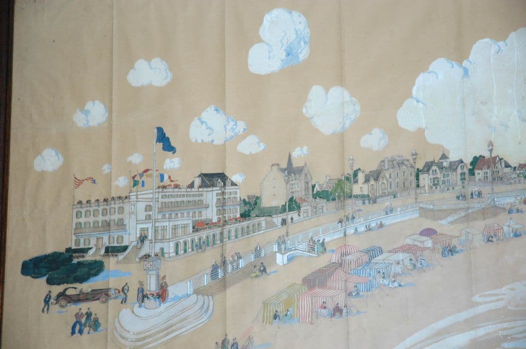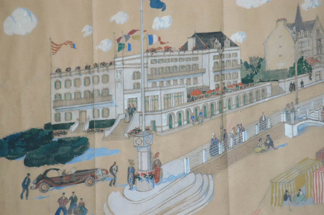 Représentation du front de mer à Quiberon avec la plage et ses cabines de bains, la digue et les maisons bordant le littoral.