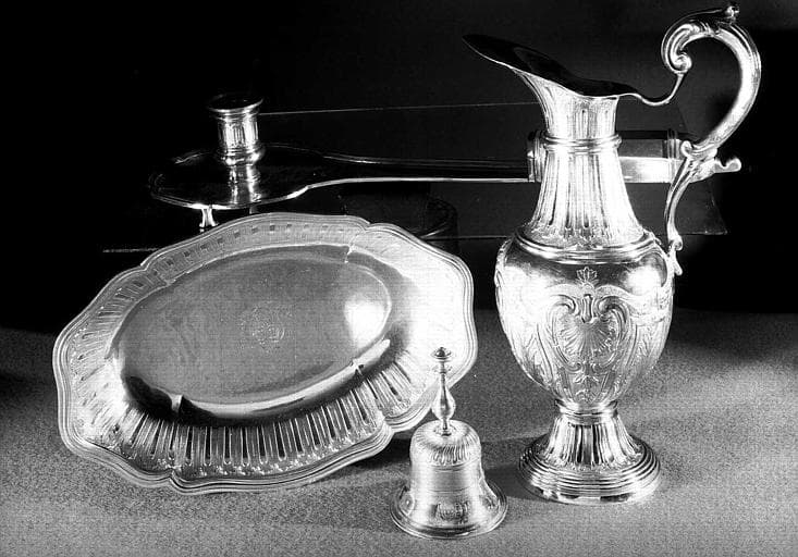 chapelle du cardinal de Montmorency-Laval (calice, plateau, aiguière, clochette, 2 burettes, plateau à burettes, bougeoir)