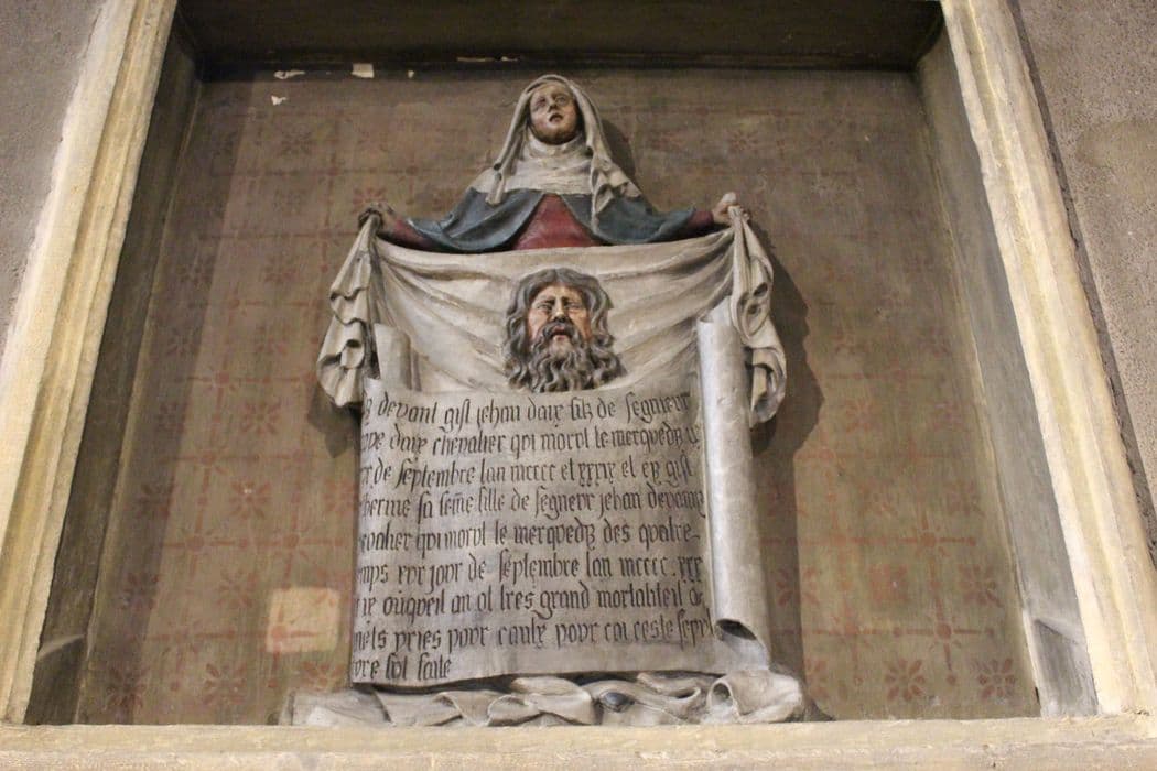 Sainte Véronique, haut-relief, pierre sculptée polychrome, avec inscription funéraire.