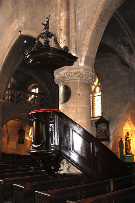 L'escalier s'enroule autour du pilier, avec une rampe qui se compose de panneaux séparés par des pilastres cannelés. Elle semble plus récente et doit avoir été exécutée lors de son transfert à l'église Saint-Eucaire. La cuve comporte deux panneaux à grand cadre séparés par des pilastres en tronc de pyramide dont le fût s'orne d'un décor sculpté. La chaire se termine par un cul-de-lampe auquel s'accrochent des consoles sculptées au droit des pilastres de la cuve. La même division apparaît sur l'abat-voix couronné par trois consoles renversées supportant un angelot debout. Le creux de la moulure ceinturant l'abat-voix s'orne d'une frise de feuilles d'acanthes de faible relief.