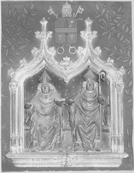 Bas-relief de deux évêques assis. peinture moderne datant de la restauration de 1858. L'ensemble taillé fortement en relief dans un seul bloc, est pris sous un double arc en accolade, se terminant en fleurons et dont les rempants l'ornent de crochets. Latéralement ce décor repose sur deux colonnettes aux chapiteaux fleuris.