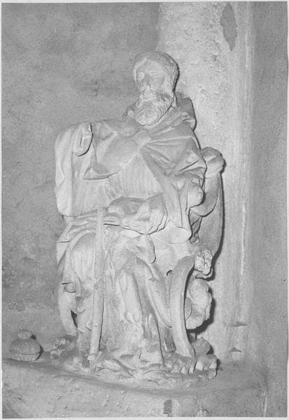 Statue en pierre de Jaumont. Le personnage (peut-être saint Antoine) est assis sur un siège, aux pieds fortement galbés se terminant en griffes de lion. Un petit personnage (diablotin ?) jaillit sur le côté gauche émergeant des plis du manteau du saint, en arrière du pied du siège.