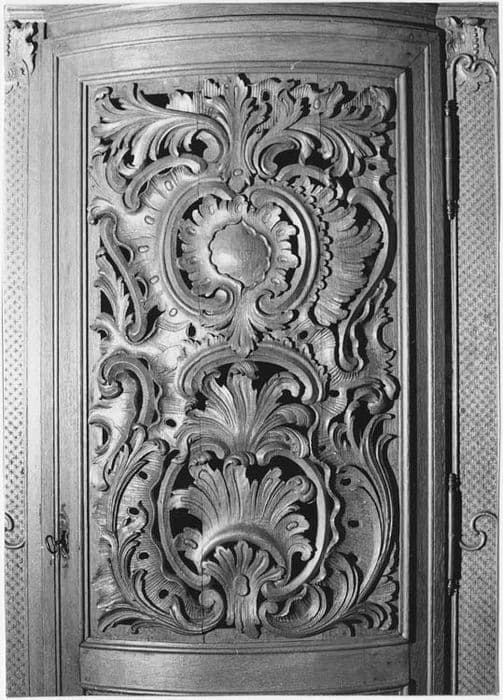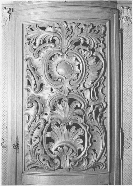 Le meuble est à trois loges, la partie centrale réservée au confesseur étant seule fermée par une porte. Celle-ci, de galbé convexe en plan, est à deux panneaux dont celui du dessus, rectangulaire, de hauteur sensiblement double, est clos d'un décor ajouré de rocailles et de volutes végétales.