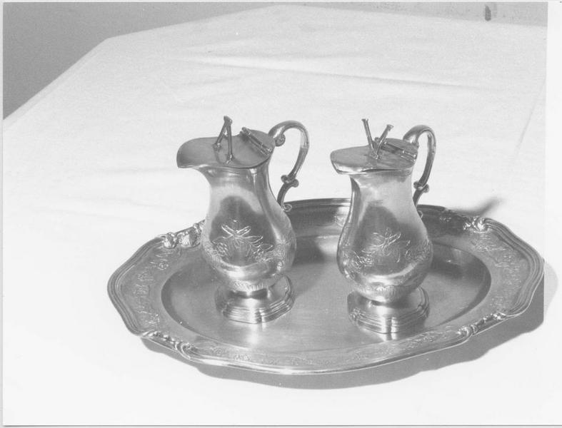 Argent doré repoussé, anses en argent doré repoussé, ciselé et fondu. plateau avec une bordure chantournée et moulurée comportant quatre éléments de rocaille soudés qui viennent l'enrichir. Burettes avec la base du corps ciselée, les pieds chantournés et moulurés, le couvercle portant soudé à la verticale une le ttre indiquant le contenu et les anses formées de deux volutes soudées en S.