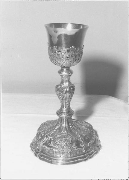 Argent doré, repoussé (pied, fausse-coupe, coupe), fondu (tige). Le pied chantourné, fortement bombé, porte une tige avec un beau noeud piriforme amati d'acanthes et de roses ; la fausse-coupe, abondamment repercée, offre un décor foisonnant où se mêlent des épis de blé, des pampres et des orses sur un fond de rocaille. La patène ne porte pas de décor.