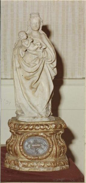 La statuette repose sur un socle, auquel elle n'était sans doute pas associée à l'origine et qui contient, sertie dans un médaillon ovale entouré d'une guirlande, une relique de sainte Prisque. Le cou recollé de l'enfant, laisse apparaître la marque de la cassure. La couronne de la Vierge est fixée en haut de la tête par une vis. La taille du dos de la statue n'est qu'ébauchée.