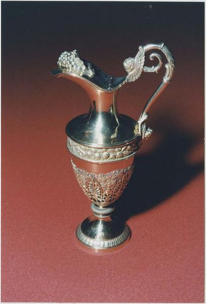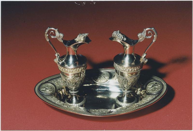 Sur les burettes : eau. Roseau sur la fausse coupe ajourée, coquillage sur le couvercle. Vin, grappe de raisin sur la fausse coupe et grappe sur le couvercle. Bordure de fleurs et de fruits, fondu, autour du ventre. 2 têtes d'ange aux anses. Plateau : 4 médaillons ovales reliefs : les 4 évangélistes. Décor de roseaux.
