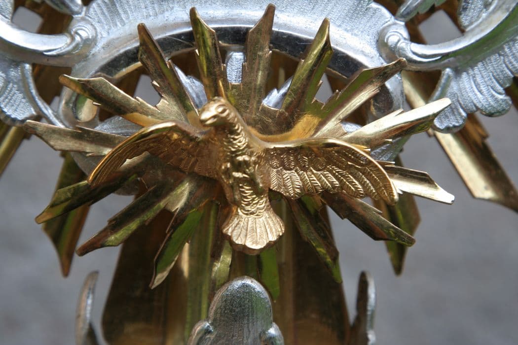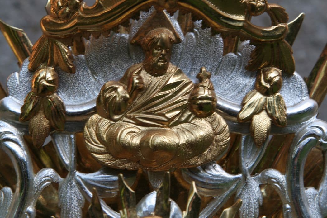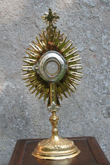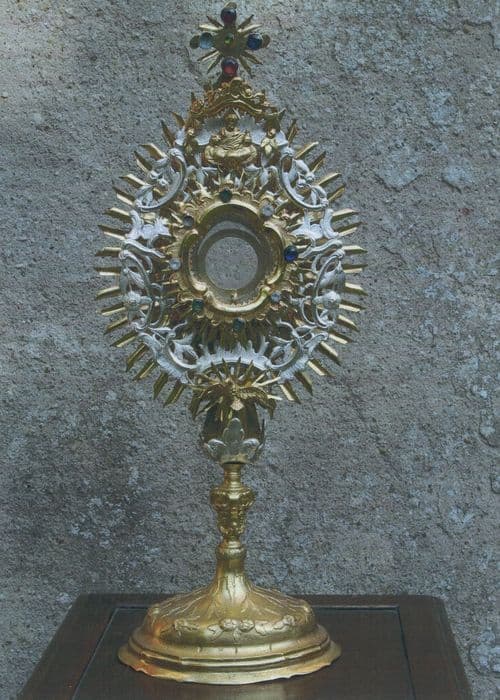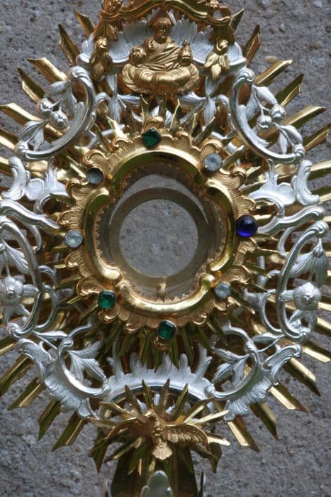 Ostensoir orné d'un soleil à double rayonnement et rinceaux de feuillages autour de la lunulle. Des applications : Dieu le Père et la colombe de l'Esprit. Pierreries sur la croix sommitale et autour de la lunulle.