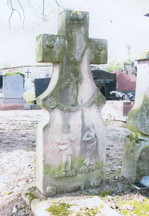 Sur l'avant : Christ en croix et des têtes d'anges (deux au sommet et un à chaque bout des croisillons). Une guirlande de feuillage, terminée par des enroulements, sépare la partie inférieure de la croix. Sur cette base : deux personnages qui peuvent être identifiés comme l'apôtre Jean et la Vierge Marie posés sur des nuages. La bordure gravée de losanges se termine par des enroulements. A l'arrière : les cinq plaies, deux têtes d'anges et un voile suspendu par trois points. L'iconographie des cinq plaies se retrouve sur un autre monument de ce cimetière mais aussi sur les reliquaires de la Sainte-Croix de la même époque.