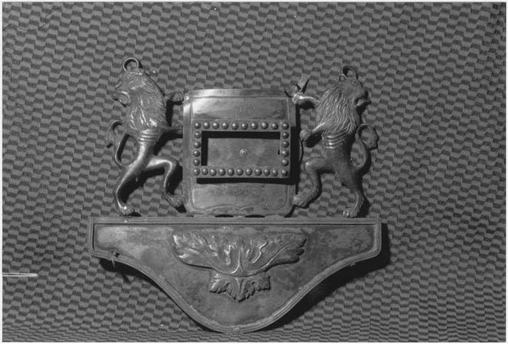 Une console en chapeau de gendarme renversé, décorée d'une double feuille d'acanthe opposée, supoorte un cartouche central, de type écu, à ouverture triangulaire bordée d'un rang de perles flanquée de deux lions debout et regardant vers l'extérieur.
