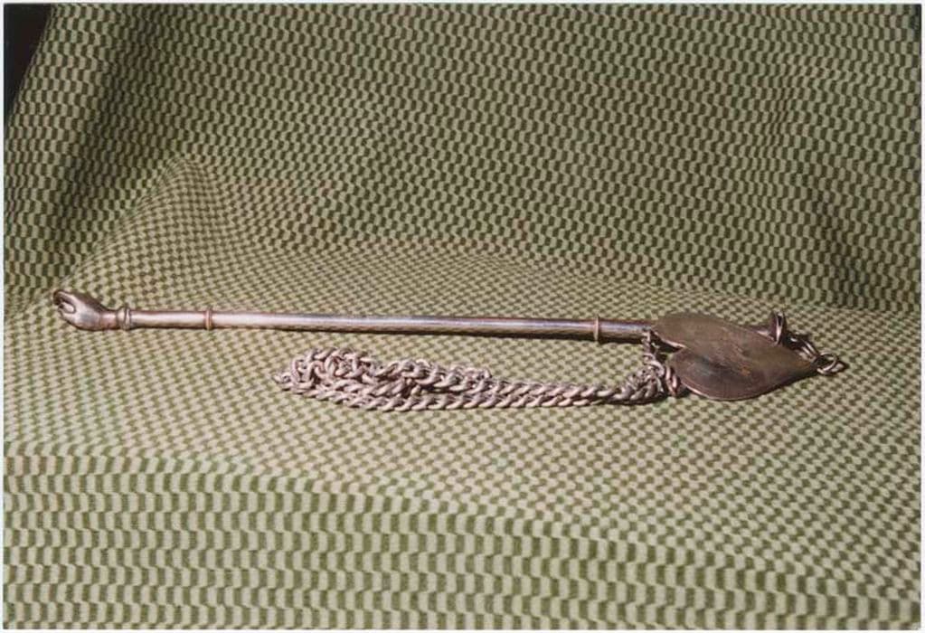 Yad comportant un chaînette et un coeur. La main de lecture est fichée au bout d'un manche tubulaire fin décoré de deux bagues de métal. Une sphère aplatie termine ce manche, muni d'un anneau auquel est fixé le coeur (en argent ?) qui porte une inscription. La chaînette est fixée par des anneaux aux lobes supérieurs du coeur.