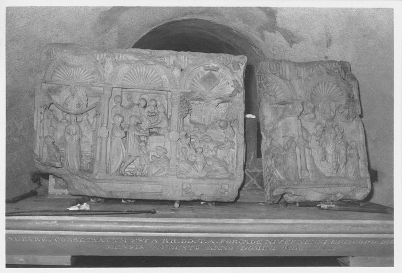Cinq petites scènes sur fond de paysage ou d'architecture, séparées par des pilastres et surmontées d'arcature de style Renaissance. A chaque extrémité du retable, le donateur et la donatrice à genoux. quelques écussons avec armoiries. Le retable est en deux morceaux. Une des scène manque presque complètement.