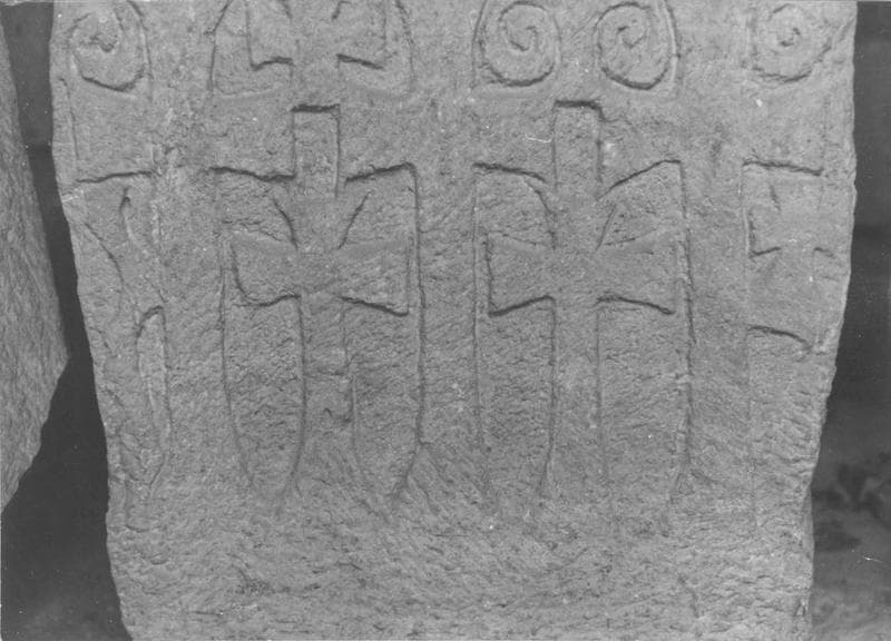 Sarcophage et son couvercle. Tête décorée de trois grandes croix, deux moyennes entre les précédentes et deux plus petites, l'une en haut à gauche, l'autre plus bas à droite.