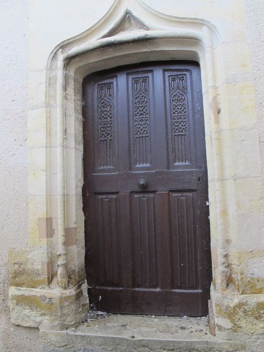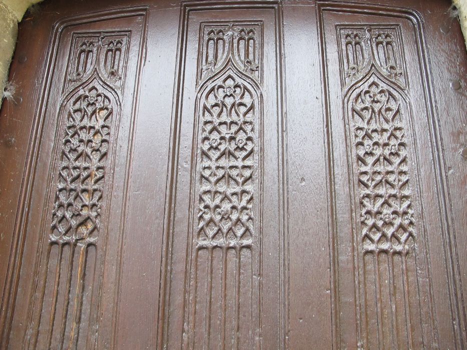 Vantail de la porte extérieure de la sacristie. bois sculpté à décor de serviettes et de fenestrages.