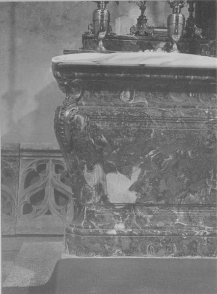 Aux angles de l'autel, il y a une applique de bronze doré. Une autre applique au centre a disparu.