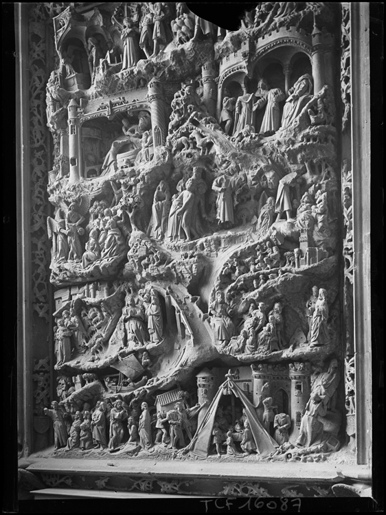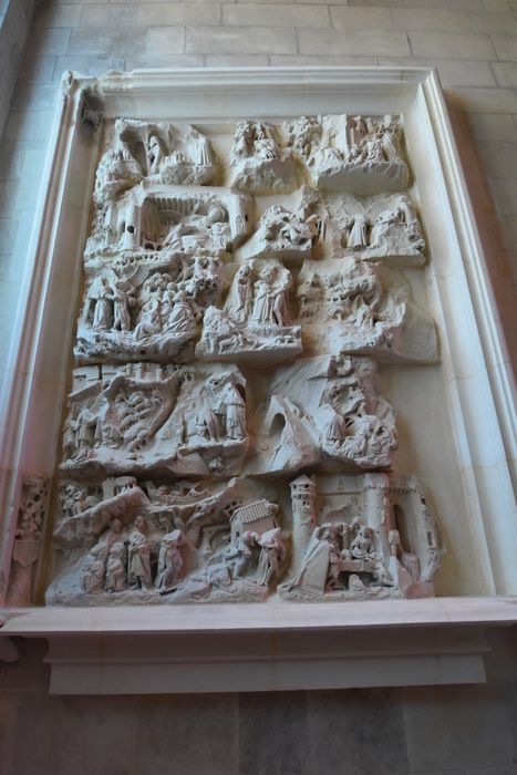 Immeuble par destination. Inventaire 1906, Immeubles par destination, n°5, p. 5, Contre retable de l'autel d'une chapelle du collatéral nord, La vie de Saint-Jean-Baptiste, pierre sculptée, XVe siècle