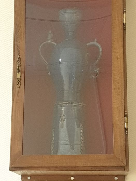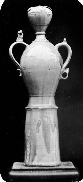 Epi vernissé teinte bleue, avec anses portant à la partie supérieure des débris de colombes brisées.