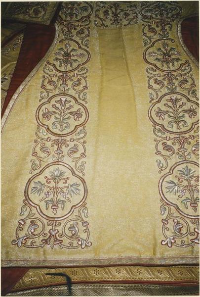 Ensemble d'ornements comprenant des nappes d'autel, trois étoles, 26 manipules ou étoles, 14 tissus pour des dessus de calice, 7 étuis pour linge, 24 bourses pour linge après la bénédiction (début 20e siècle), 13 chapes communes, 1 chape en soie (18e siècle, de même type que celle décrite dans la salle près du choeur), 1 chape (vers 1850) avec bordure de fleurs et velours rouge, 1 chape de même décor (140x135 cm), 2 chapes de 140 cm de diamètre avec une bordure sans motif et tissée de fils d'or, une chape en satin gris avec médaillon, 3 chapes de couleur violette en moire, bordure d'argent, 1 chape en fil d'or rebrodé (140x160 cm) avec bouquet de fleurs brodé d'or (fin 20e s.), 7 étuis pour le linge, 24 bourses pour le linge ayant servi après la bénédiction. Dans le chapier : 3 chapes, 6 dalmatiques et 6 dalmatiques rouge et or, 5 dalmatiques, 1 chape noire, 3 dalmatiques, 5 dalmatiques, 8 chapes et dalmatiques du drap d'or commandés à la maison Biais aîné fils et Rondelet (74, rue Bonaparte à Paris en 1877), 12 ensembles dont 1 en soie, 1 étole en soie (18e s.) qui fait partie du même ensemble que les éléments cités précédemment. Ensemble de 11 pièces, ensemble de 7 pièces, ensemble de 16 pièces, ensemble de 8 pièces et 1 chape, ensemble de 17 pièces.