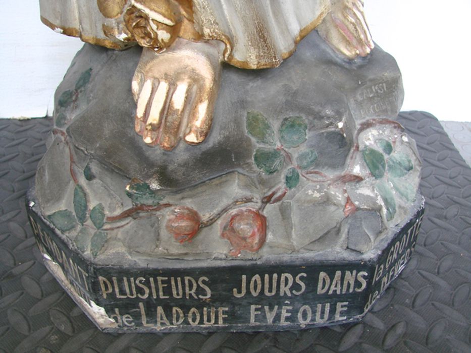 Le socle porte l'inscription suivante : Cette statue a reposé pendant plusieurs jours dans la grotte de Lourdes où elle a / été bénite par Mgr. Ladoue évêque de Nevers le 21 septembre xx 74 [1874]