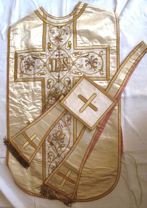 chapelle en soie blanche unie brodée composée de 4 pièces : chasuble, manipule, étole et bourse de corporal, maison "À l'enfant de choeur"