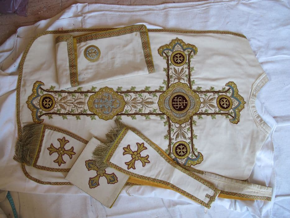 chapelle ; chasuble ; manipule ; étole ; bourse de corporal ; voile de calice