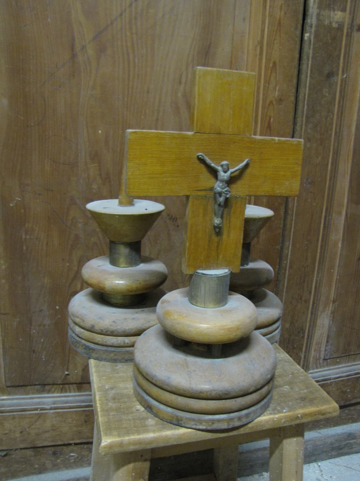 Croix : h = 34, 5 ; la = 18, 5 ; diam = 16 : Christ : h = 8 ; Chandeliers : h = 27 ; diam = 16
