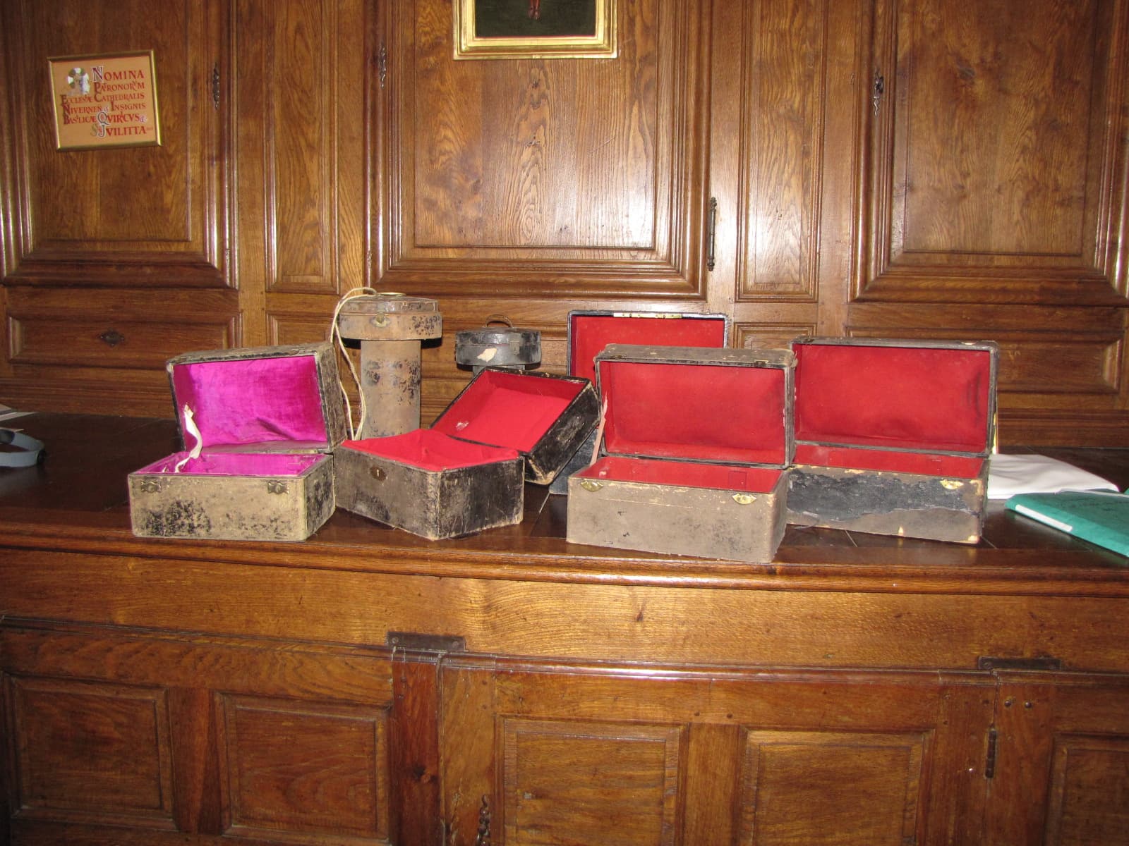 Sept boîtes et écrins pour des pièces d'orfèvreries. Plusieurs étiquettes : "calices à usage de M…"", ""Calice à usage de M…"", ""Calice à usage de la fabrique de M. Cheminade"", ""Calice XVIIe appatement à M… Pierre Legras""