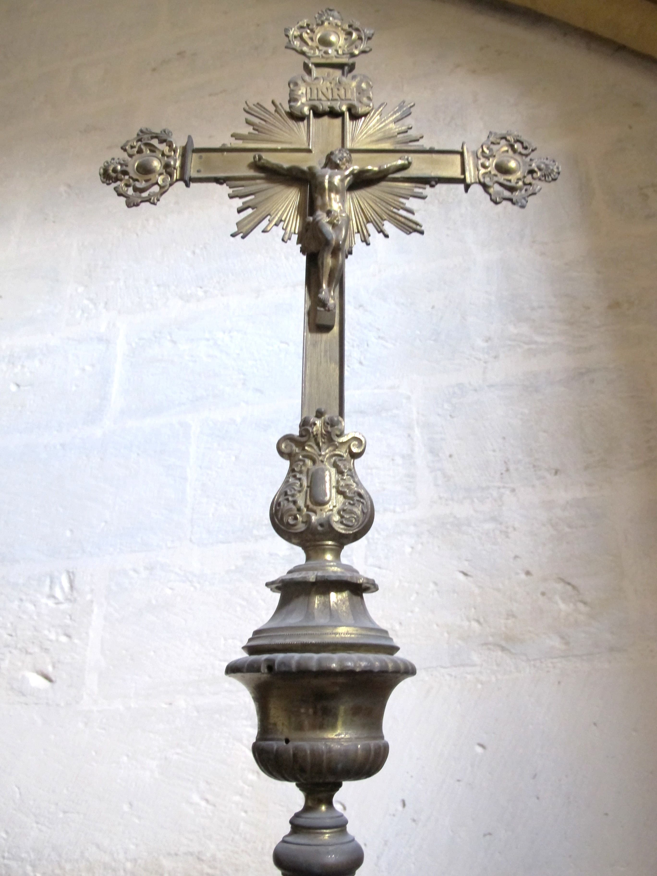 Hampe avec cinq bagues annelées, croix rayonnante, plaque vissée sous le bras gauche de la croix